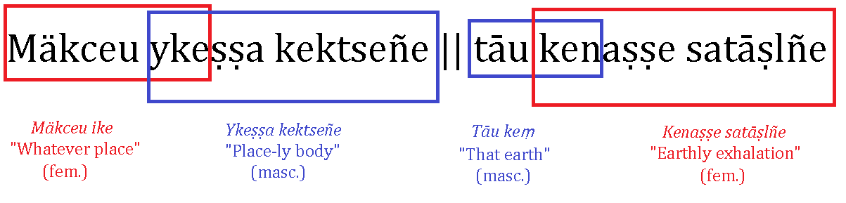 The brilliance of the poem rests on the fact that the second adjectives of both units, ykeṣṣa and kenaṣṣe, are both formed with the adjectival suffix -aṣṣa/e as applied to nouns: ykeṣṣa from the feminine noun ike "place", kenaṣṣe from the masculine keṃ "earth". But here's the twist. Though built on a feminine noun, ykeṣṣa is the masculine form of the adjective; kenaṣṣe is feminine.
